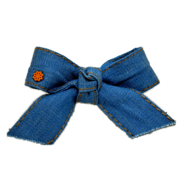 Laço feito com fita jeans de 2 cm aramada. Acabamento com nó tradicional.